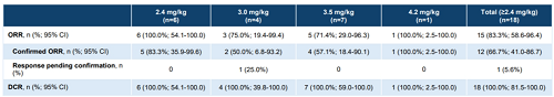 ≥2.4mg/kg剂量组的总体治疗人群(n=86)的中位无进展生存期(PFS)为6.7个月,6个月PFS率为55.3%;二线治疗人群中(n=42)的中位PFS尚未达到,6个月PFS率为59%(图5)。